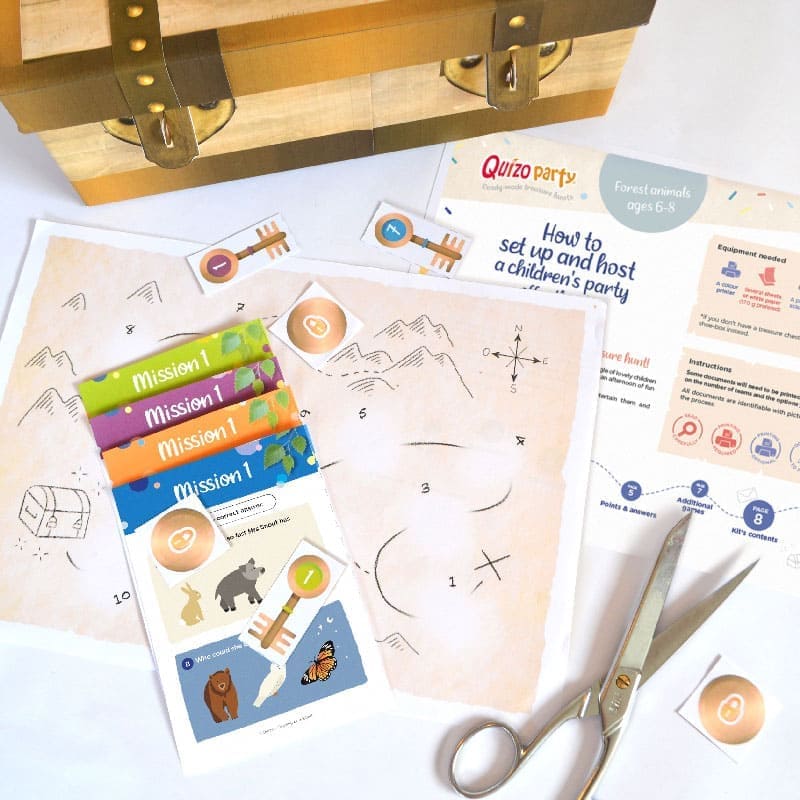 Quizoparty® is the English version of Quizotrésor®, an innovative printable kit, created in 2013 by a French mother, to entertain a group of children aged 6 to 12 during a birthday party.